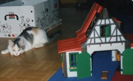 Nicki ist am 18.08.1998 auf einem Bauernhof geboren,ihre Katzenmama ließ die kleine neugeborene Maus einfach liegen,und wollte nichts von ihr wissen.Dosis Tochter Melanie hat sie gefunden. Nicki war schon sehr ausgekühlt und so kam die kleine zu meinen Dosis. Nicki wurde von Frauchen und Melanie mit der Flasche aufgezogen,und heute ist sie eine wunderschöne gesunde Katzendame. Sie ist eine Richtige Glückskatze,und das nicht nur wegen ihrer Fellfarbe 3-farbig.Wie man sehen kann ist Nicki ist ein Perser-Mix.Und wie Katzen Mädels so sind kann die auch ganz schön zickig sein.Nicki versteht sich am besten mit Tapsi.Also kein Zickenarlarm... |